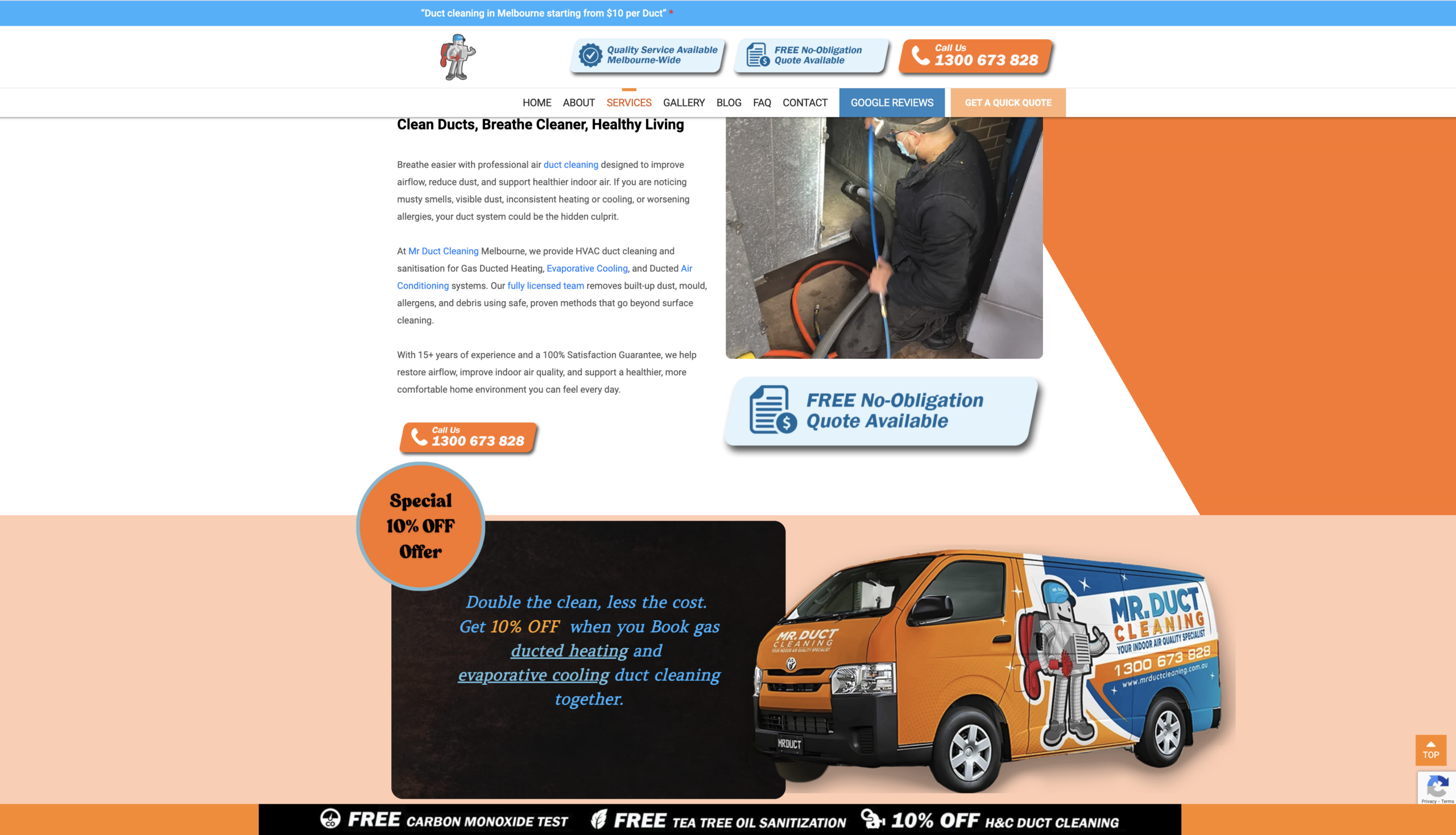 As part of my SEO services for Mr Duct Cleaning, a leading provider of professional duct cleaning and HVAC services in Melbourne, I was tasked with enhancing their online presence, improving organic search rankings, and driving customer engagement. My goal was to help them attract more local customers, improve visibility, and ensure a seamless user experience on the website.